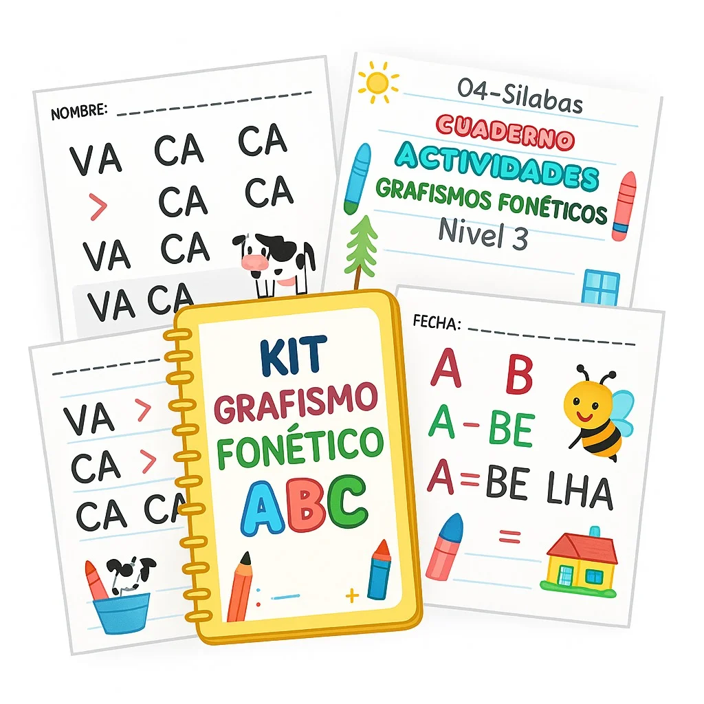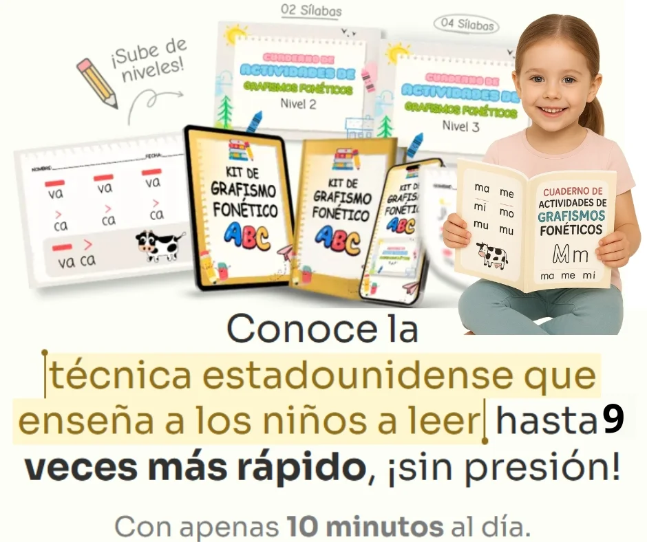 Con el Kit de Grafismo Fonético, basado en el método americano de alfabetización, tu hijo aprende a leer hasta 9 veces más rápido —¡de forma divertida,simple y eficaz,directamente desde casa!
