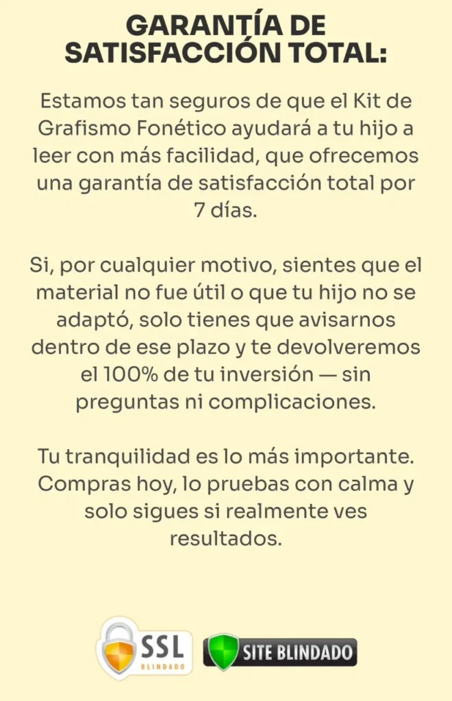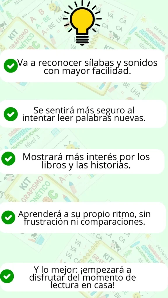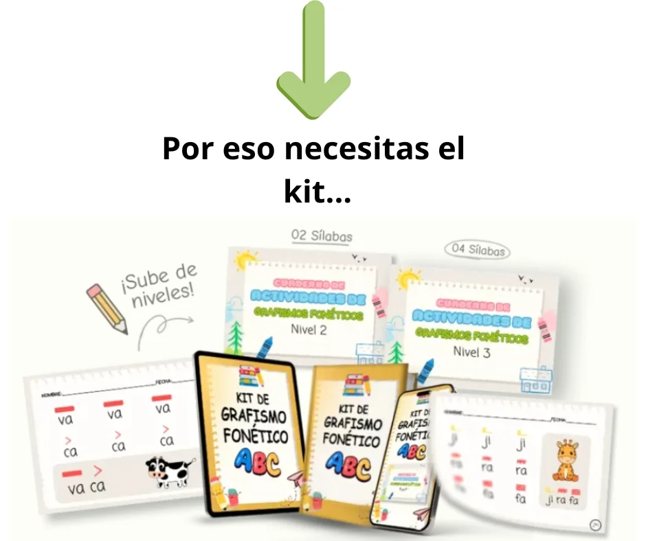 Con el Kit de Grafismo Fonético, tu hijo desarrolla el cerebro para aprender a leer de forma ligera, a su ritmo, ¡y con resultados visibles en pocos días!